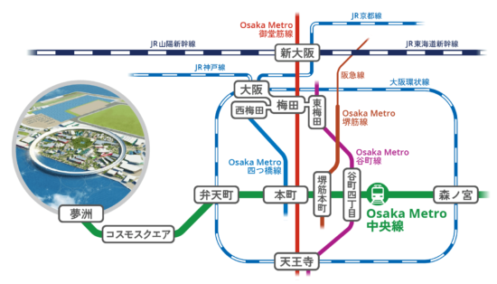 大阪市内からのアクセスは、大阪メトロ中央線(延伸区間含む)がもっとも便利です。