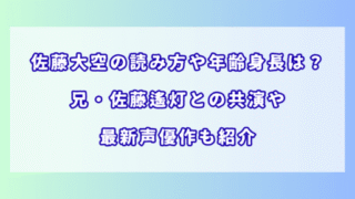 俳優 佐藤大空の読み方や年齢身長は?兄・佐藤遙灯との共演や最新声優作も紹介 最近ドラマや映画で注目を集める子役・佐藤大空さん。2025年にはディズニー&ピクサー作品で声優デビューも果たし、俳優としてだけでなく多方面での活躍が期待されています。この記事では、佐藤大空さんの年齢・身長といった基本プロフィールから、兄・佐... 2025.10.18 俳優子役