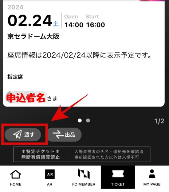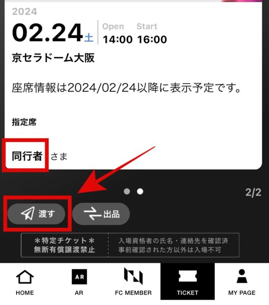 ⑨横にスワイプすると同行者のチケットが表示されていますので【渡す】をタップします。