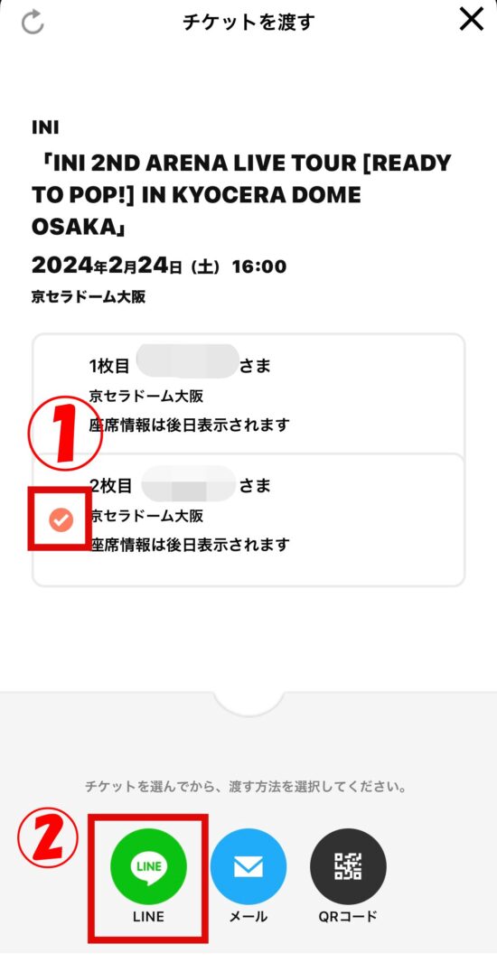 ⑩同行者に分配するチケットに☑を入れてLINE、メール、QRコードのいずれかを選択します。