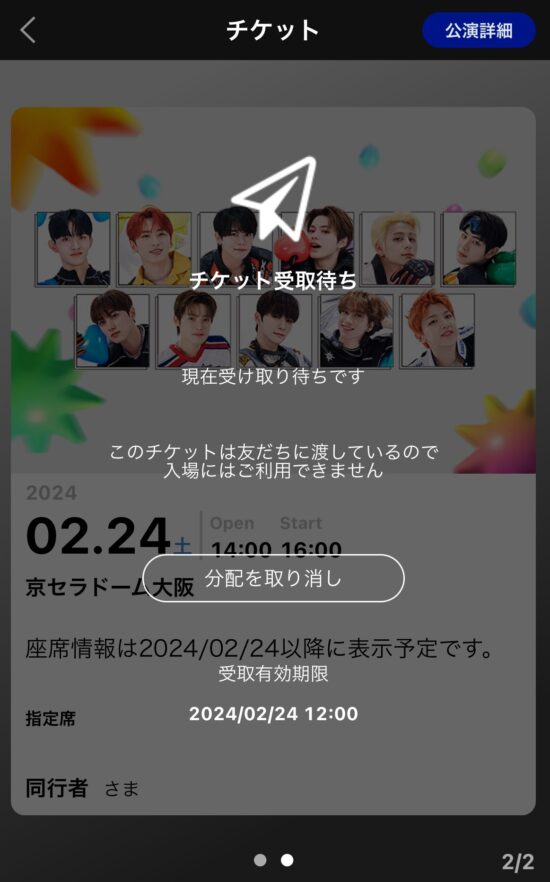 同行者に分配できるのはライブ前日の12時以降からとなっています。