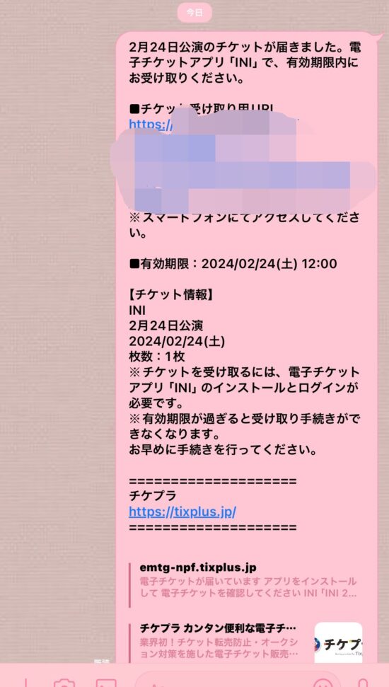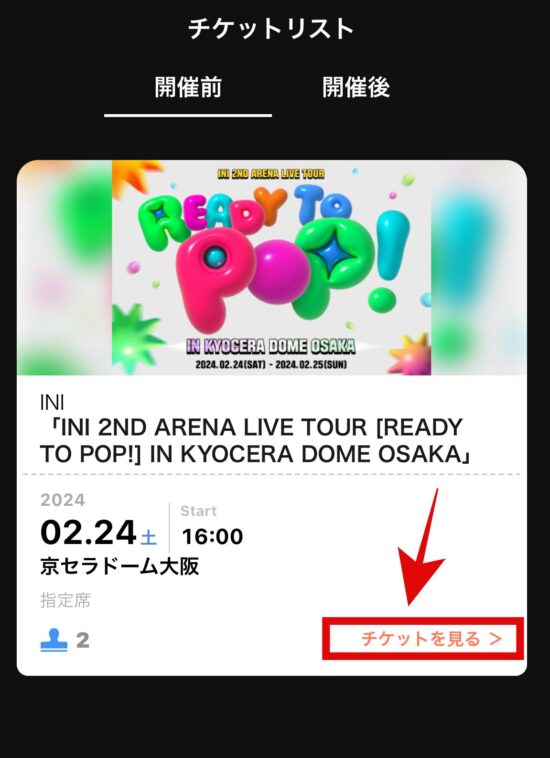 2024年2月24日(土)に開催されるINI 2ND ARENA LIVE TOUR [READY TO POP!] IN KYOCERA DOME OSAKAでは2月9日(金) 15:21に【チケプラ】から受け取り開始のメールが届きました。