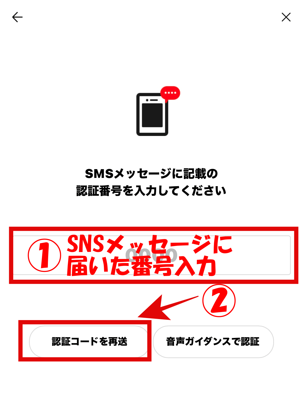 ④SNSメッセージに届いた4桁の番号を入力します。