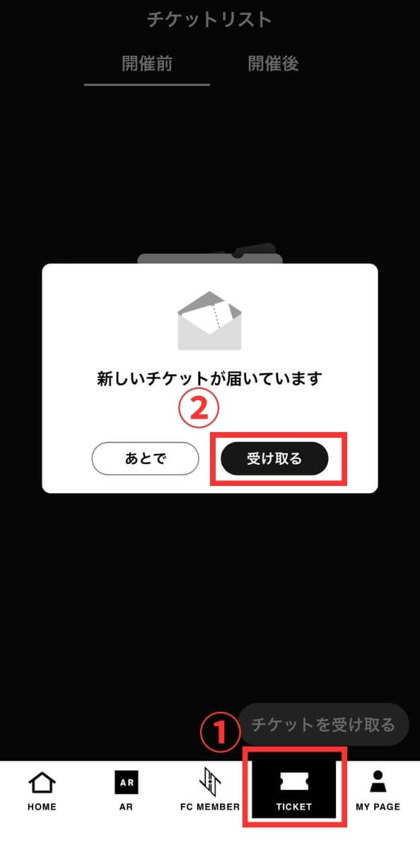 【INI OFFICIAL APP】を開き下にあるTICKETをタップすると、受取可能になるとチケットが届いています。