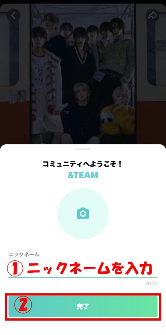 ①お好きなニックネームを入力したら、②【完了】をタップします。