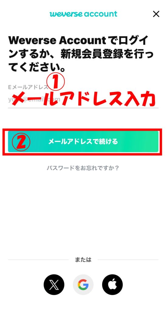 ログイン情報WeverseとWeverse Shopで同じメールアドレスとパスワードを使用する必要があります。