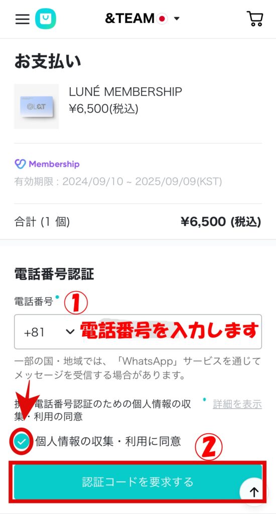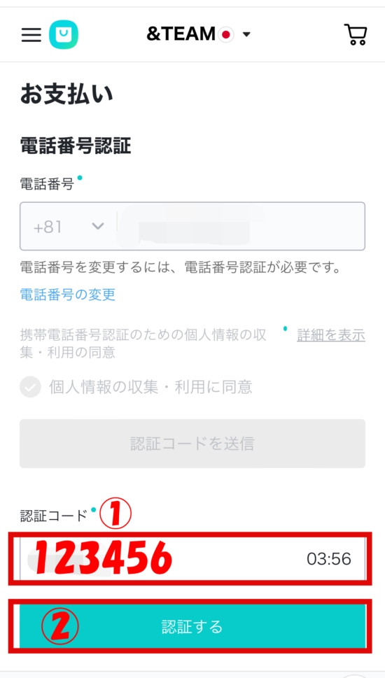 ①電話番号を入力し、【個人情報の収集・利用に同意】に✔を入れます。