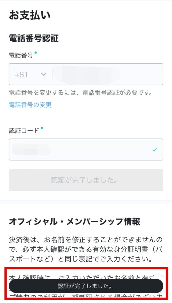 認証コードが合っていれば、【認証が完了しました】と表示されます。